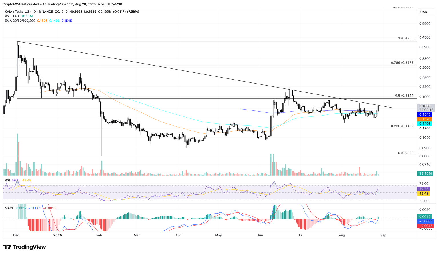 Kaia edges higher by over 7% at press time on Thursday, challenging an overhead resistance trendline on the daily chart (shared below). The uptrend is underpinned by Kaia Chain’s adoption by the South Korean exchange Upbit, enabling USDT transactions for its users.