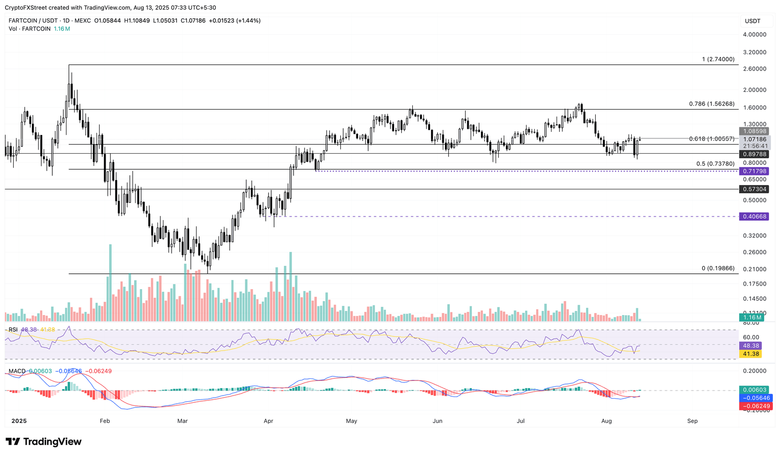 To reinforce an uptrend, FARTCOIN should surpass the $1.085 level to outgrow the bearish engulfing candle formed on Monday. This could extend the rally to the 78.6% Fibonacci level at $1.562.