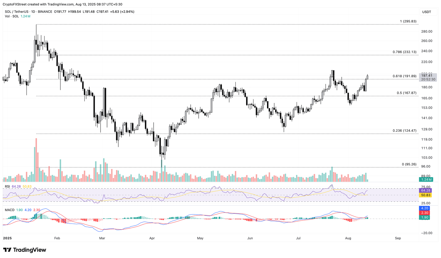 A decisive close above the 61.8% Fibonacci level could extend the uptrend in SOL to the 78.6% Fibonacci level at $232.