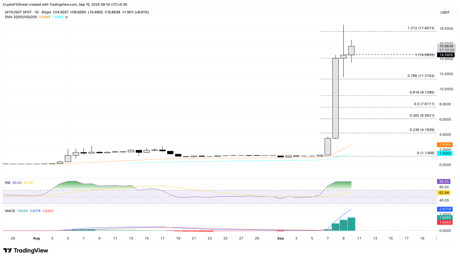 MYX Finance edges higher by 8% at press time on Wednesday, building on the 2% gains from the previous day. The uptrend in MYX accounts for over 340% gains so far this week, with a record high of $18.50 on Tuesday.