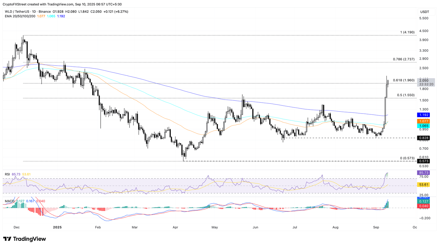 WLD trades above the 61.8% Fibonacci level at $1.96, which is drawn from the high of $4.19 on December 6, 2024, to the $0.57 low of April 7. A decisive close above this level could extend the Worldcoin rally to the 78.6% Fibonacci level at $2.73.
