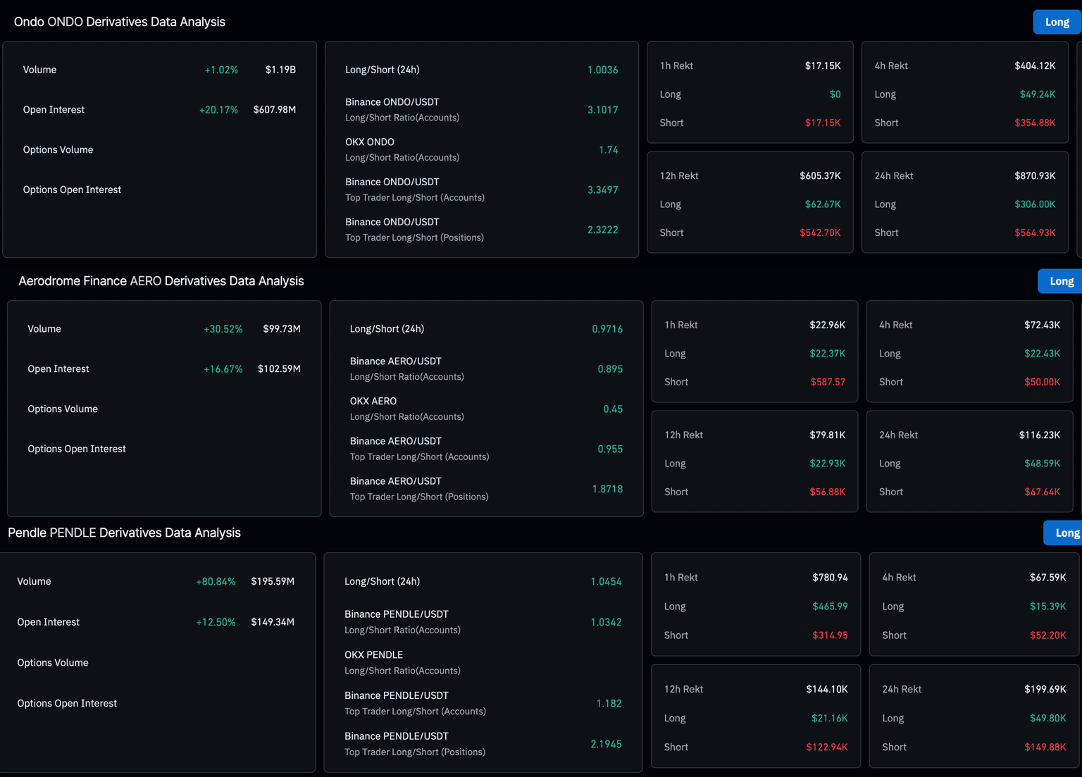 CoinGlass data shows that the Open Interest (OI) of ONDO, AERO, and PENDLE has increased by 20%, 16% and 12% in the last 24 hours, reaching $607.98 million, $102.59 million, and $149.34 million, respectively. This increase in capital inflow of DeFi token derivatives suggests that the retail demand has increased as traders anticipate the ongoing recovery run to follow through.
