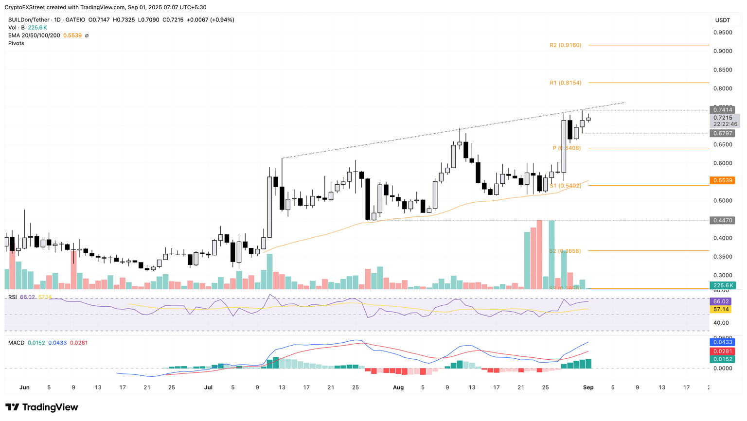 BUILDon extends the uptrend by nearly 1% at press time on Monday, challenging an ascending trendline on the daily chart, formed by connecting the peaks of July 13 and August 28. The meme coin reversed from the trendline at $0.7414 on Sunday, suggesting overhead pressure.