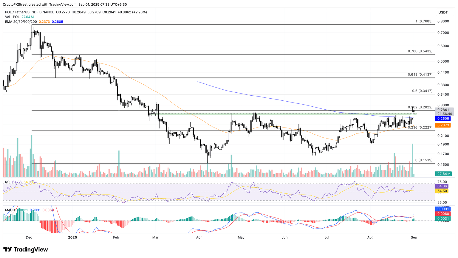 POL edges higher by over 2% at press time on Monday, extending the 8% gains from Sunday. The uptrend exceeds the $0.2750 supply zone and the 38.2% Fibonacci level at $0.28222, which is drawn from the $0.7685 high on December 3 to the $0.1519 low on April 7.