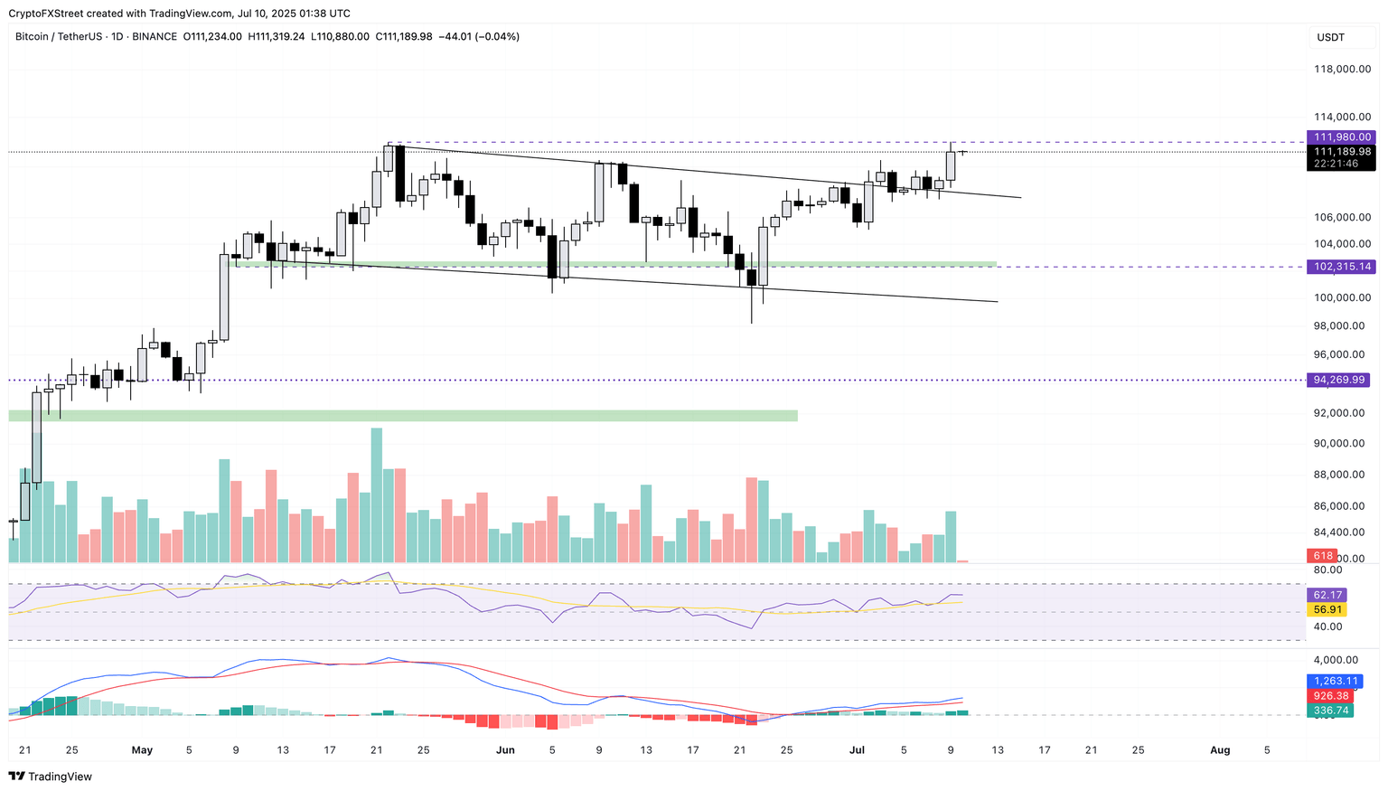 Bitcoin’s breakout from a falling channel pattern in the daily chart hits a new record high of $111,999. At the time of writing, BTC edges higher marginally, holding the gains from the previous day.