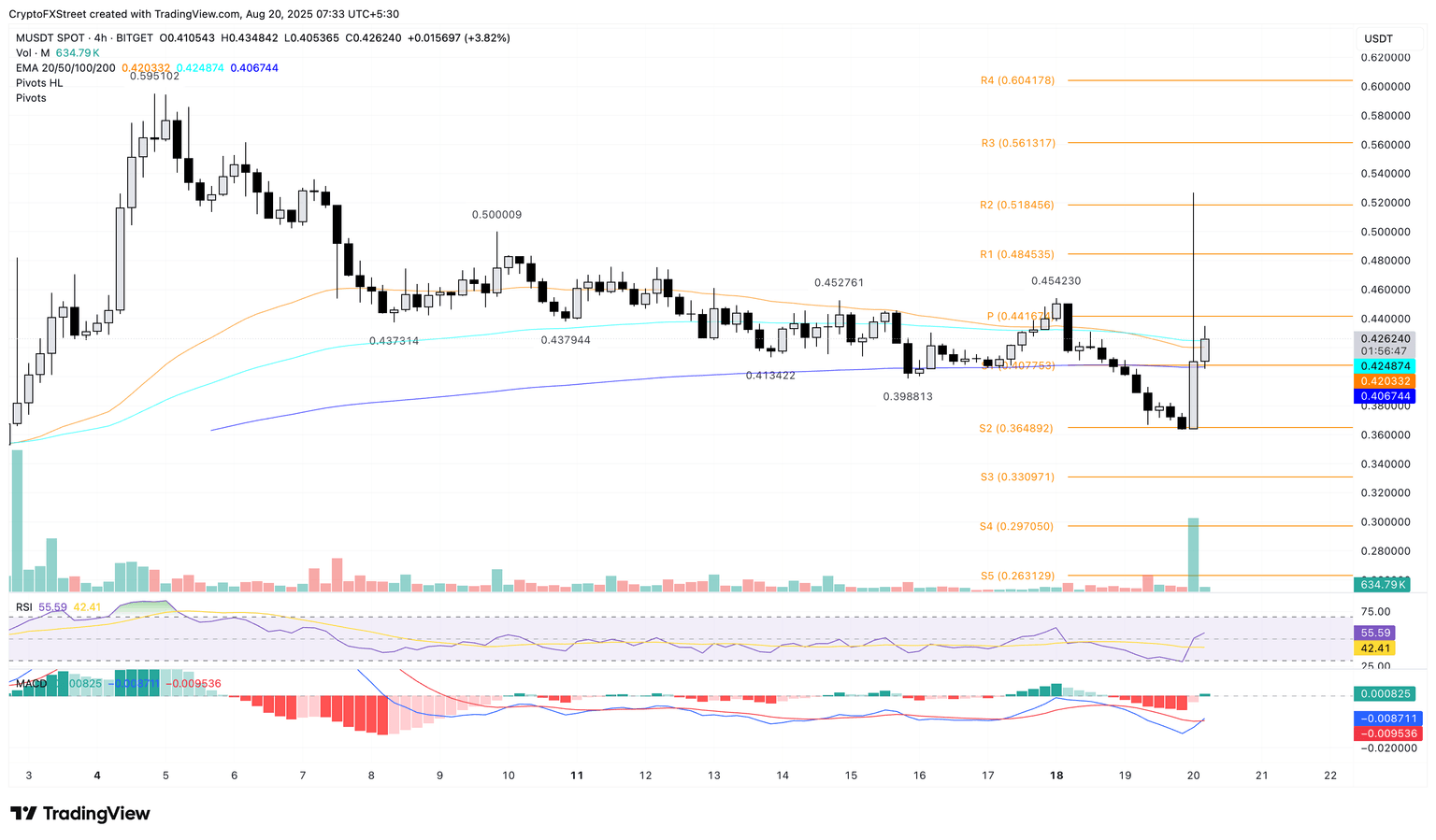 MemeCore bounces off the S2 pivot level at $0.3648 on the 4-hour chart after a sharp decline on Monday. At the time of writing, the meme coin trades at $0.4262, extending the reversal run, with the second consecutive bullish candle on the same chart.