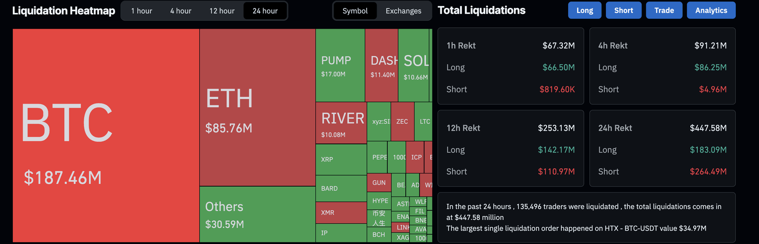 The cryptocurrency market trades in the red on Thursday after the US Senate Banking Committee (SBC) postponed discussions on crypto market structure following Coinbase's withdrawal of support due to multiple issues. Bitcoin (BTC) drops 1% by press time on Thursday, while Ethereum (ETH), Ripple (XRP), Solana (SOL), and other major altcoins decline further, leading to a spike in long liquidations.
