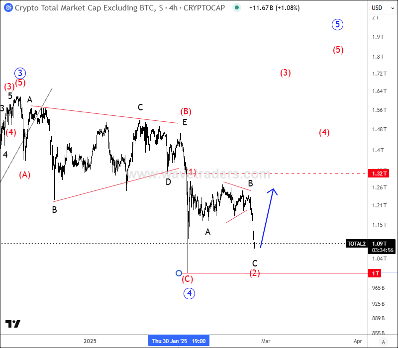 If we take a look at Crypto TOTAL2 market cap which excludes Bitcoin, it looks in much better shape, so ALTcoins are holding up well still and TOTAL2 can be just finishing wave C of an ABC pullback in wave (2) before a bullish continuation within wave (3) of a five-wave bullish cycle.