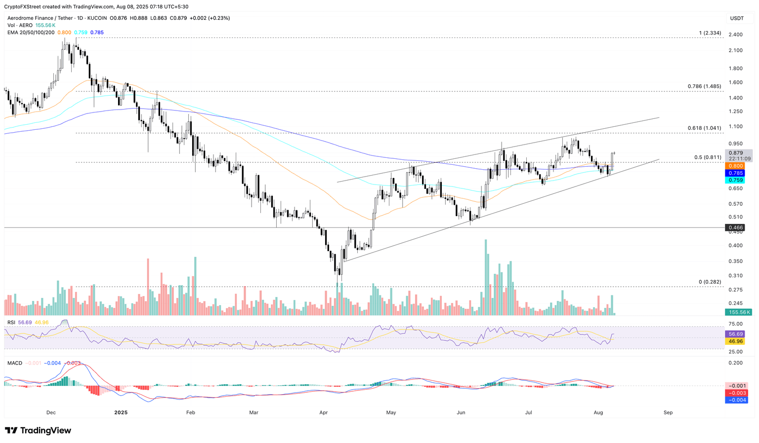 - Aerodrome Finance token bounces off within a rising channel, with bulls targeting $1.00.