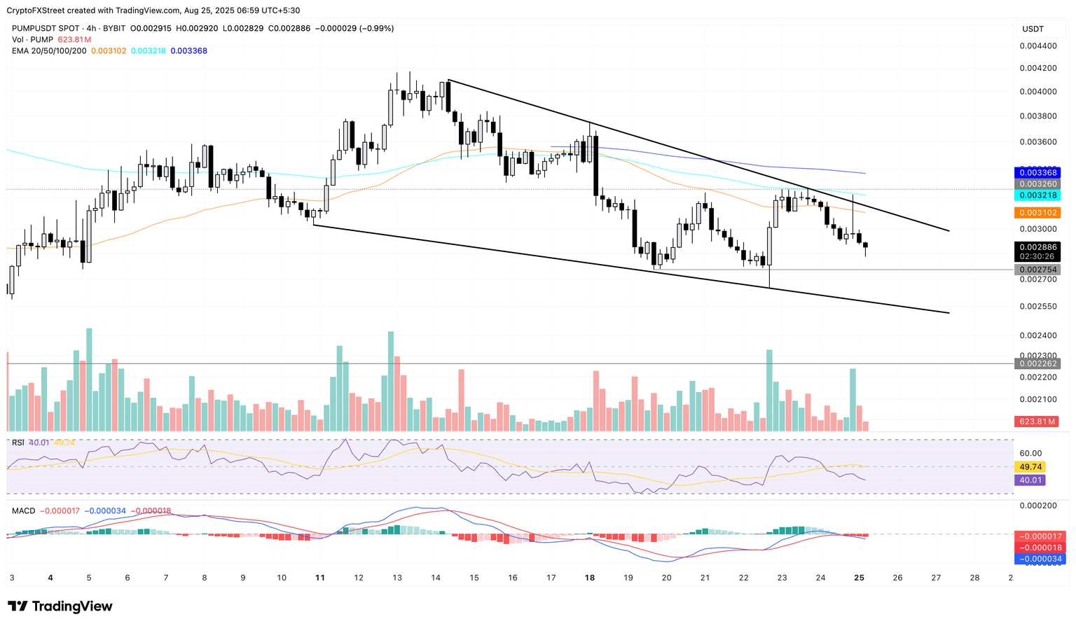Pump.fun edges lower within a falling wedge pattern on the 4-hour chart (shared below), extending the 7% drop from Sunday. The meme coin launch token trades at $0.002886 at press time on Monday, eyeing the $0.002744 support or the August 19 low.