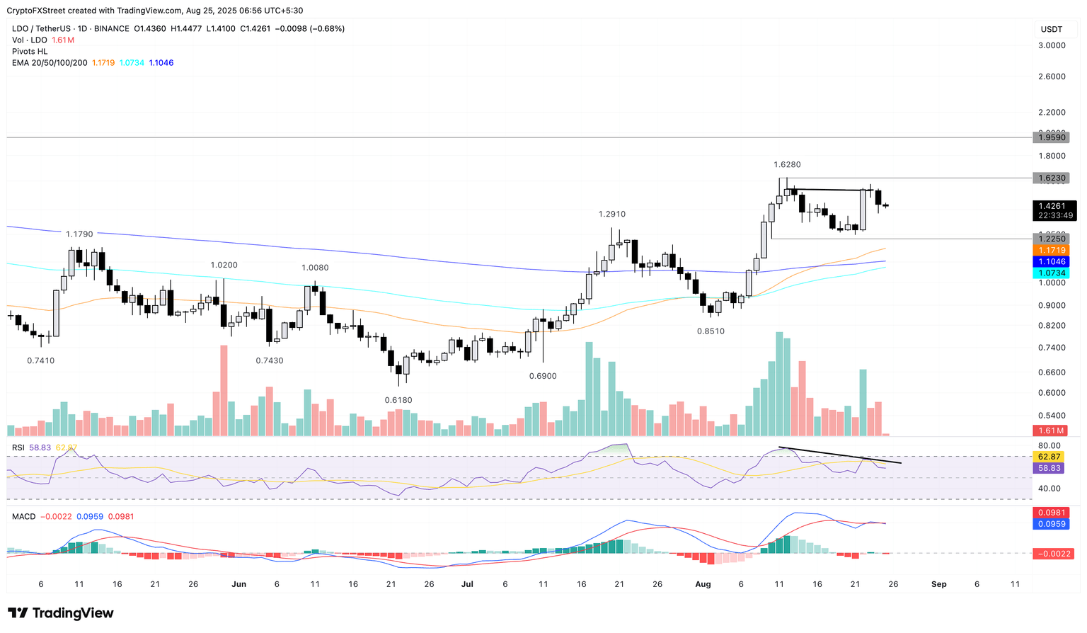 On the flip side, to reinforce an uptrend, LDO should surpass the $1.6230 high from August 12. This breakout rally could stretch the rally to $1.9590, marked by the February 17 peak.