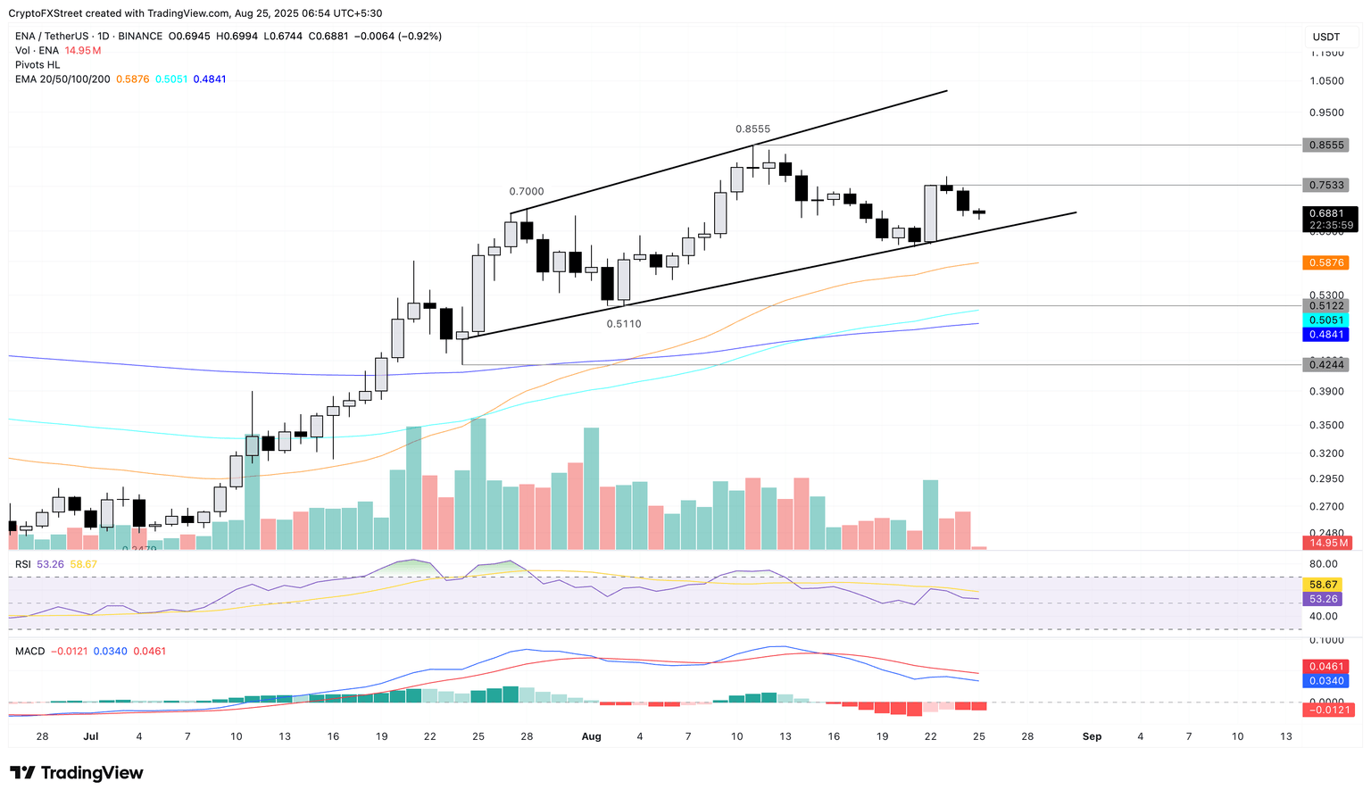 Ethena trades at $0.6881 at the time of writing on Monday, having stepped higher from its recent low of $0.6744. The synthetic dollar token trends lower for the third consecutive day, eyeing a support trendline formed by connecting the August 2 and August 21 lows, near $0.6500.