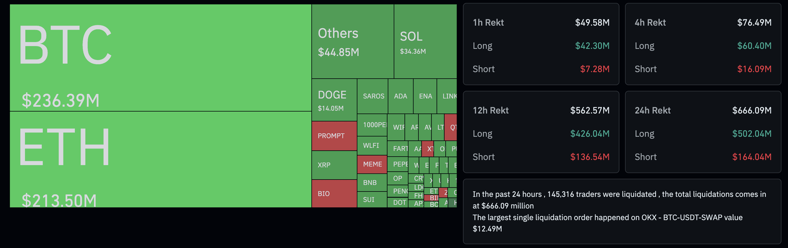 The cryptocurrency market has recorded a total liquidation of $666 million as overhead supply increases. The $502 million in long liquidations, compared to $164 million in short liquidations, highlights the widespread forced exit of bullish positions.