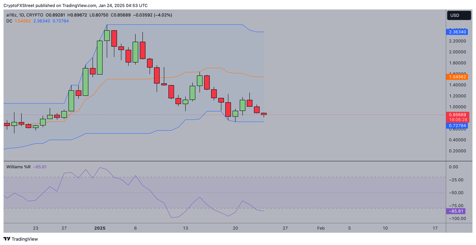 The current position of the Williams %R at -86.06 indicates extreme oversold conditions, which often precede a corrective rebound. If Ai16z can sustain above $0.8546 and break through the $1.5456 resistance, the upper Donchian Channel boundary at $2.3634 becomes the next logical target.