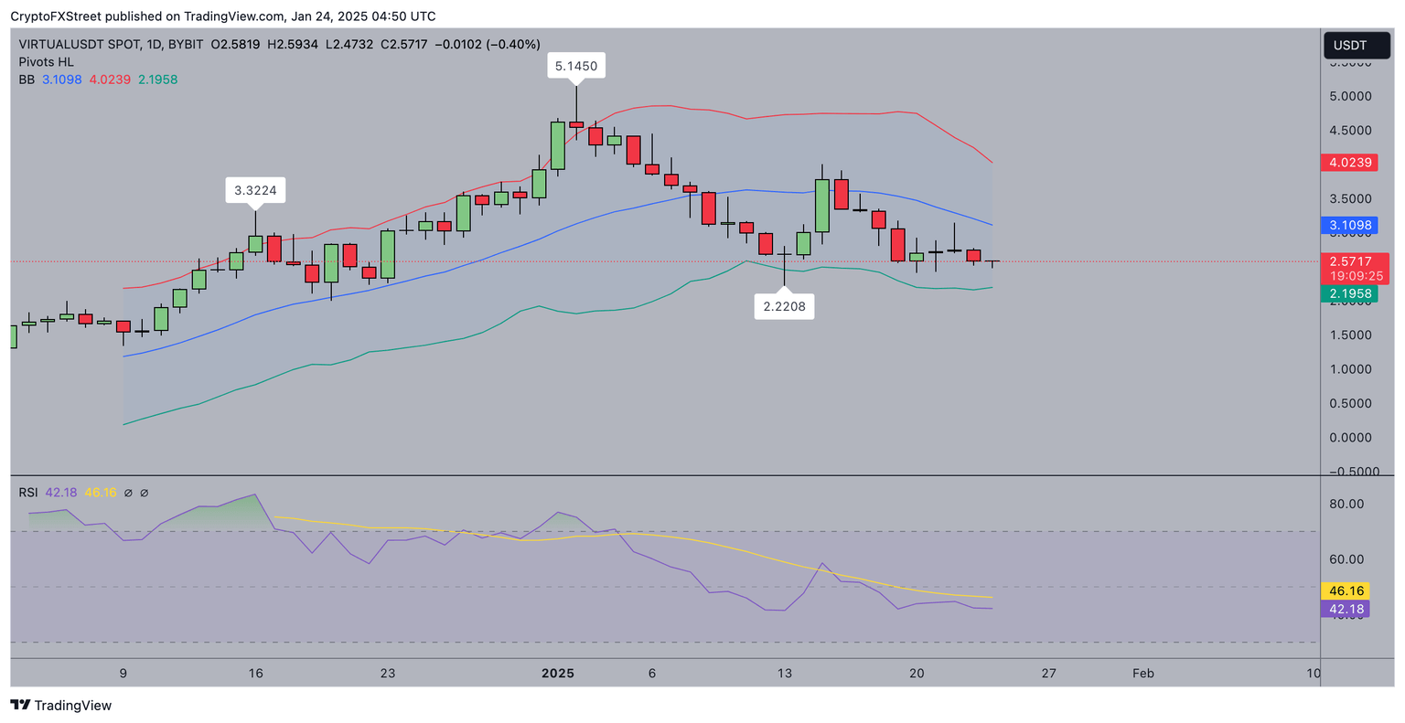 As seen in the chart below, Virtual price maintains a precarious balance near the $2.5 support zone, which aligns with the lower Bollinger Band at $2.1. This level is critical for determining VIRTUAL's next directional move.