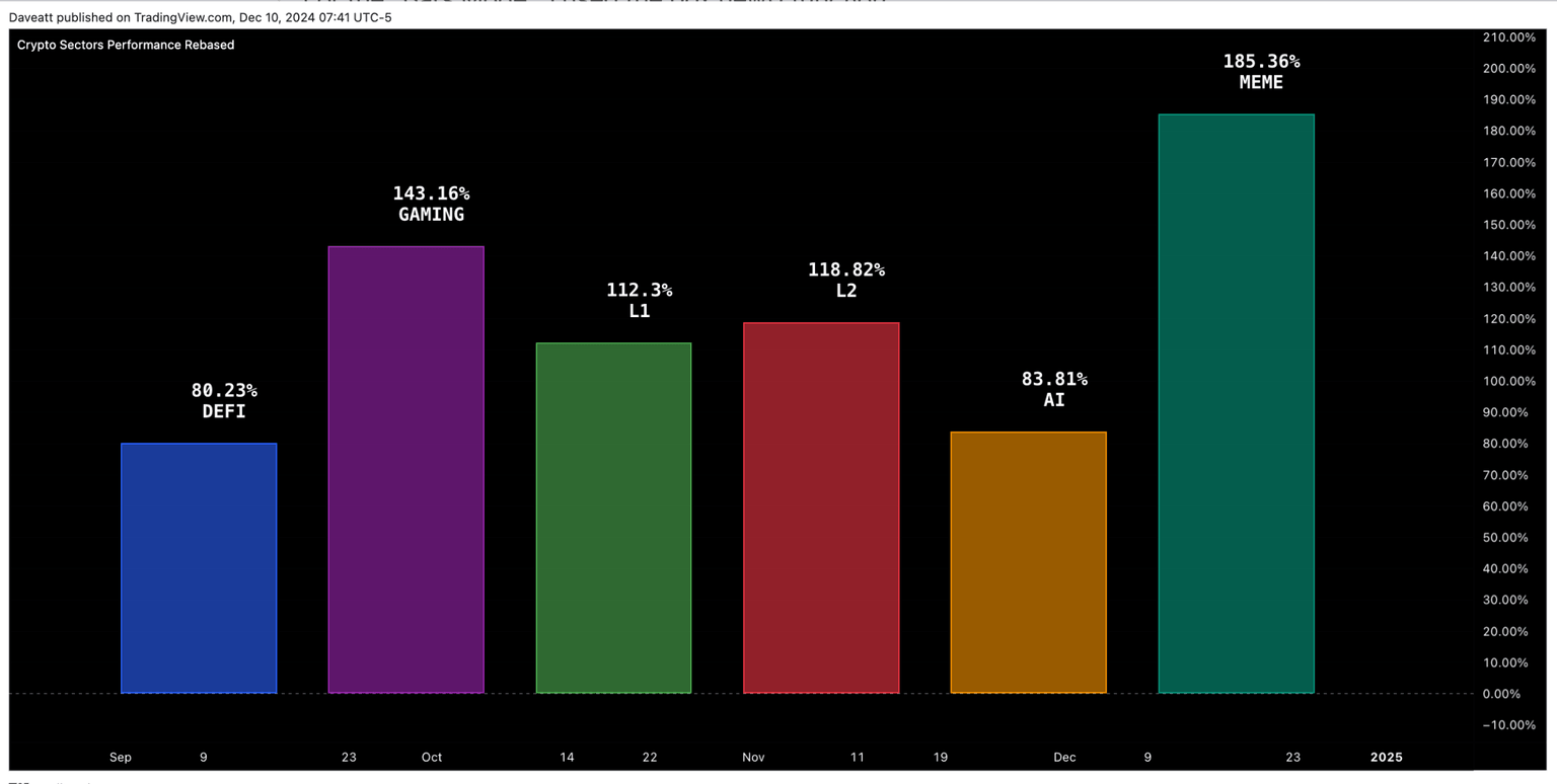 - According to TradingView data, AI and Memecoins sectors scored over 185% gains and 83% gains, respectively, in 2024.