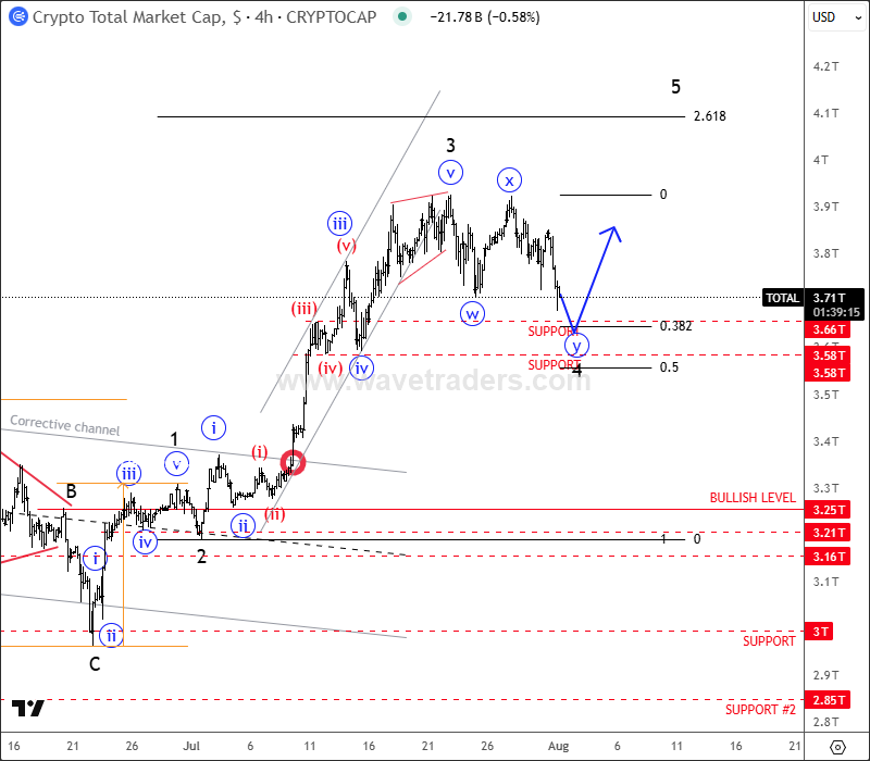 Good morning Crypto traders! Cryptocurrencies are coming slightly lower on the intraday basis due to stock market decline yesterday, but we still see them approaching support, so still be aware of a bounce and recovery at the end of the week or maybe next week because of an upcoming weekend. Crypto TOTAL market cap chart can be trading in wave »y« of a complex w-x-y correction in wave 4, unless it’s a flat correction, but support is the same at 3.6T – 3.5T area, from where we may see a bullish continuation within wave 5.