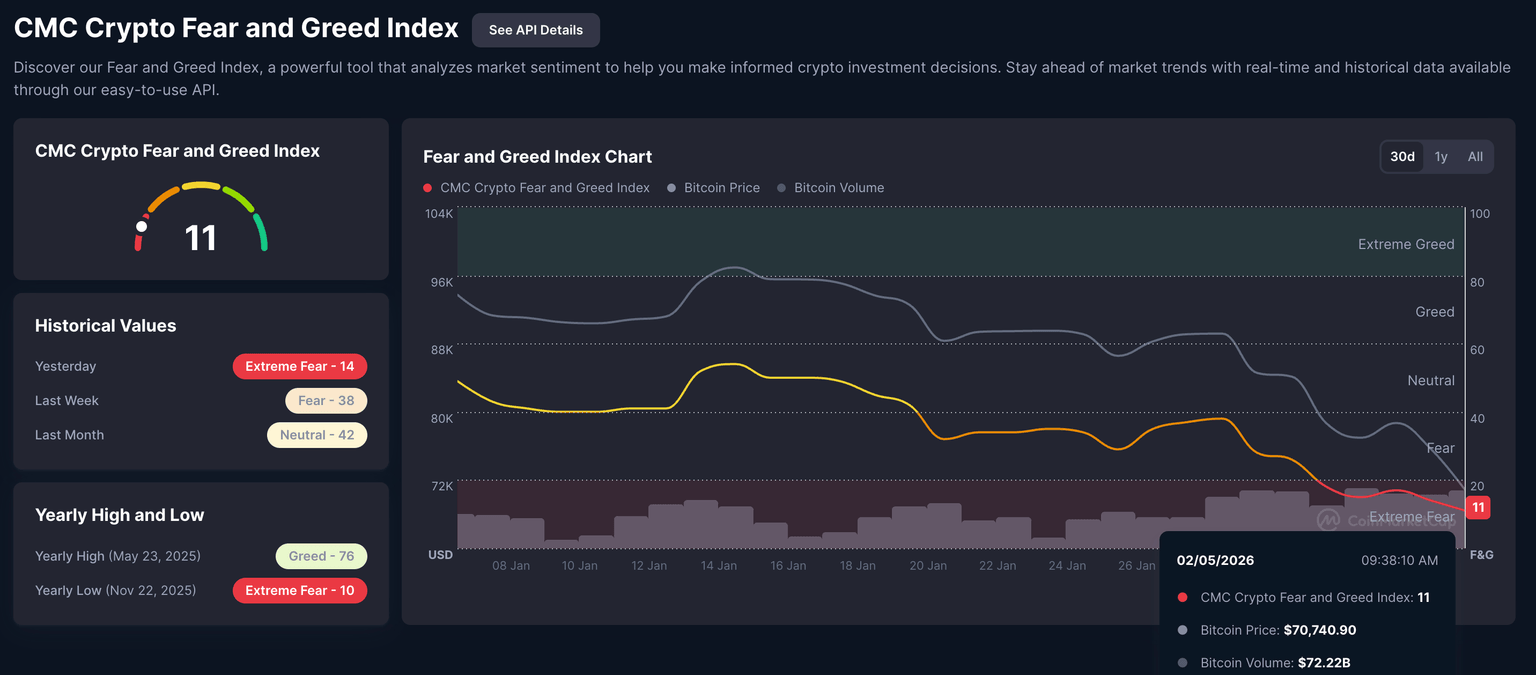 The Fear and Greed Index fell to 11 on Thursday, down from 14 the previous day, deeper into the extreme fear zone, which ranges from 0 to 25.