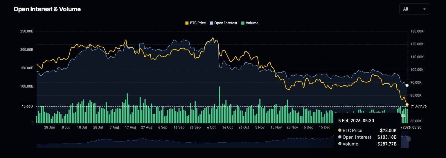 Consistent with the liquidations, the broader crypto market Open Interest (OI) has dropped to $103.18 billion, from $105.90 billion on Wednesday. This extension of the broader decline in OI reflects capital outflows amid risk-off sentiment.