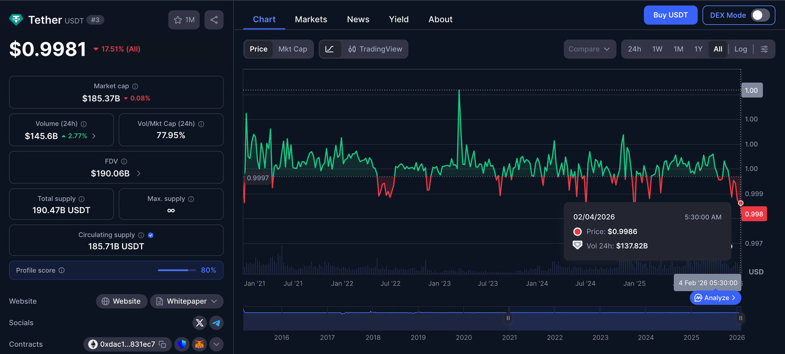 Historically, Tether’s USDT has depegged multiple times, including a 30% drop in 2018 and 6% in May 2022 during the Terra Luna crash. However, the substantial US debt held in Tether’s reserves has helped drive rebounds, and the trend continues through 2026.