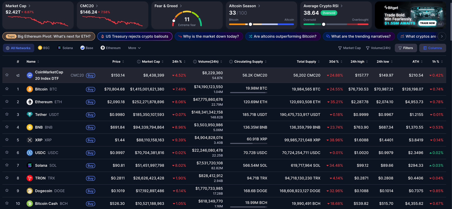 CoinMarketCap data indicates that Bitcoin is approaching $70,000 and Ethereum is coming to $2,000, with both recording over 7% declines in the last 24 hours. At the same time, BNB, XRP, SOL, and DOGE recorded losses of 6% to 9%.