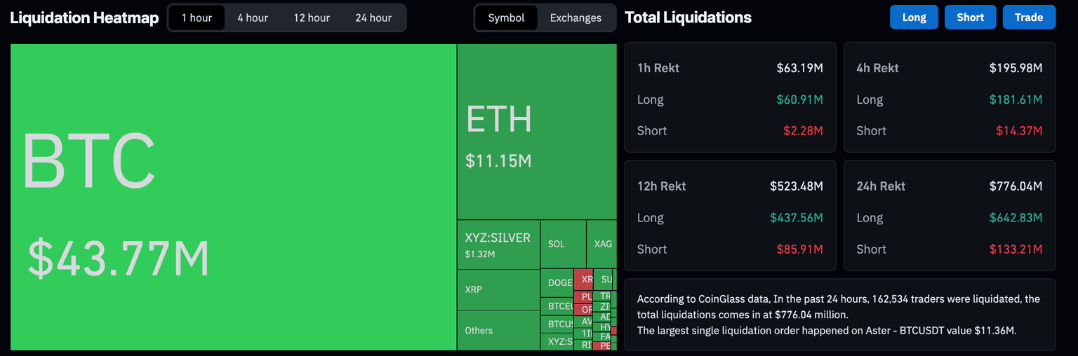 - The cryptocurrency market has lost over $775 million in total liquidations in 24 hours, driven by falling Bitcoin prices.