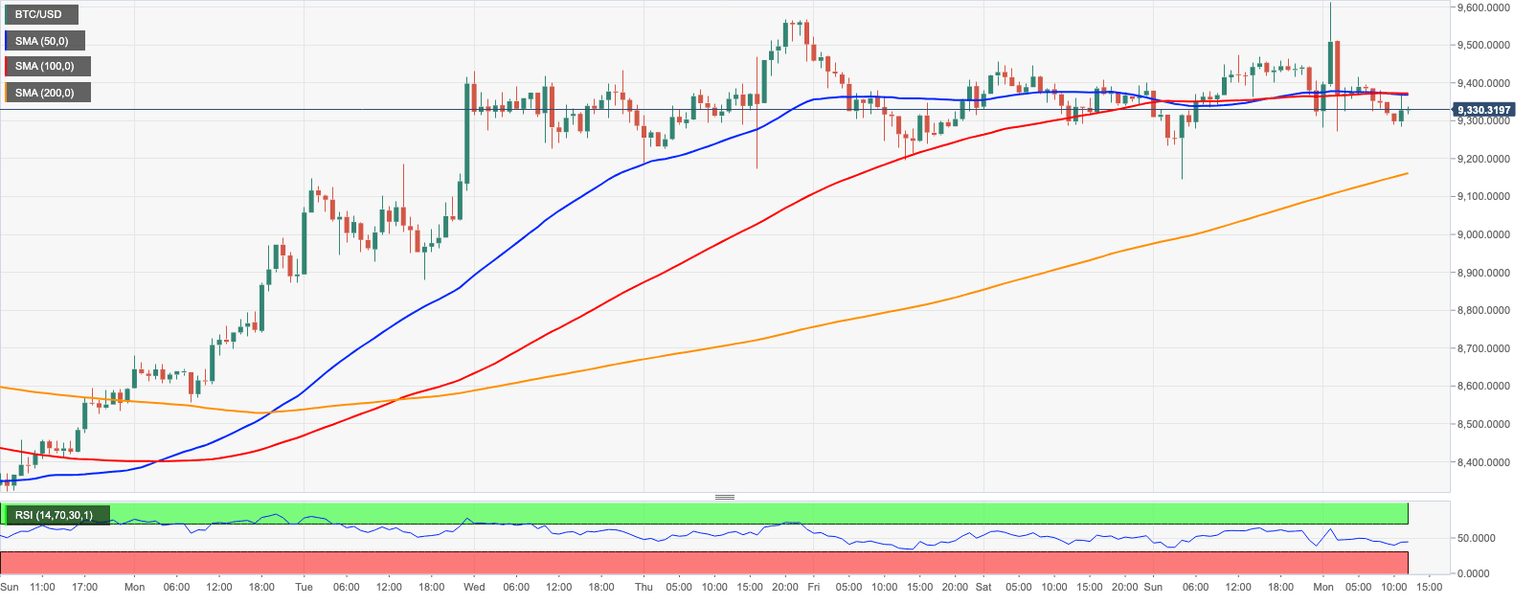 Bitcoin hovers above $9,300, mostly unchanged both since the beginning of the day and since this time on Sunday. From the short-term perspective, the world's biggest digital coin has a bearish bias, though the volatility is shrinking.