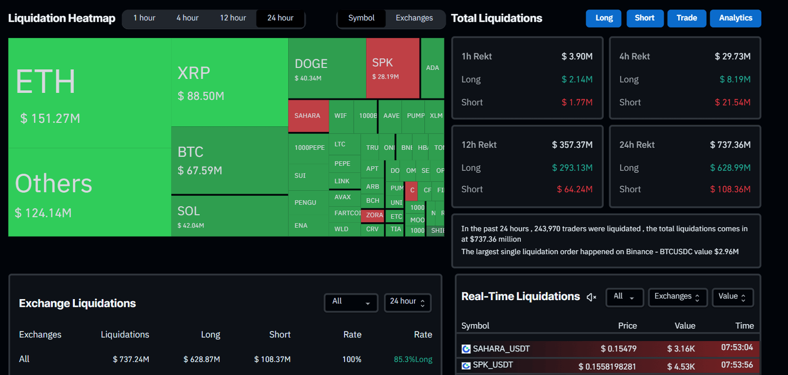 - Crypto markets fall sharply, triggering $737.36 million in leveraged liquidations over the past 24 hours.