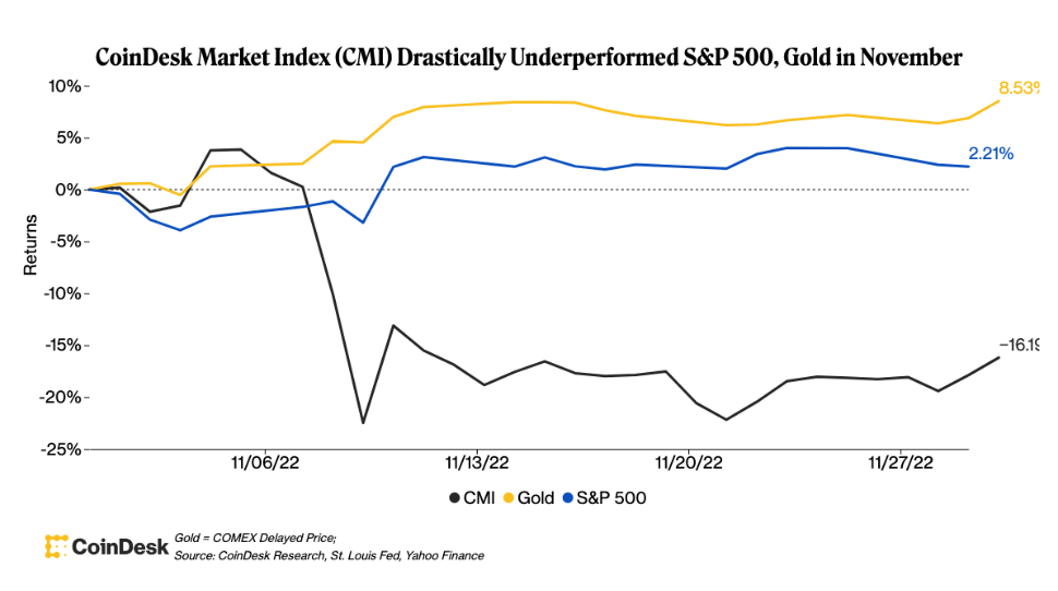 A key tone shift in crypto markets during the month was just how dramatically they diverged from the path of traditional markets. Stocks rose as investors processed speculation that the Federal Reserve might slow the pace of interest rate hikes as soon as December. The S&P 500 is up 2.2% in November, while gold climbed 7.8%.