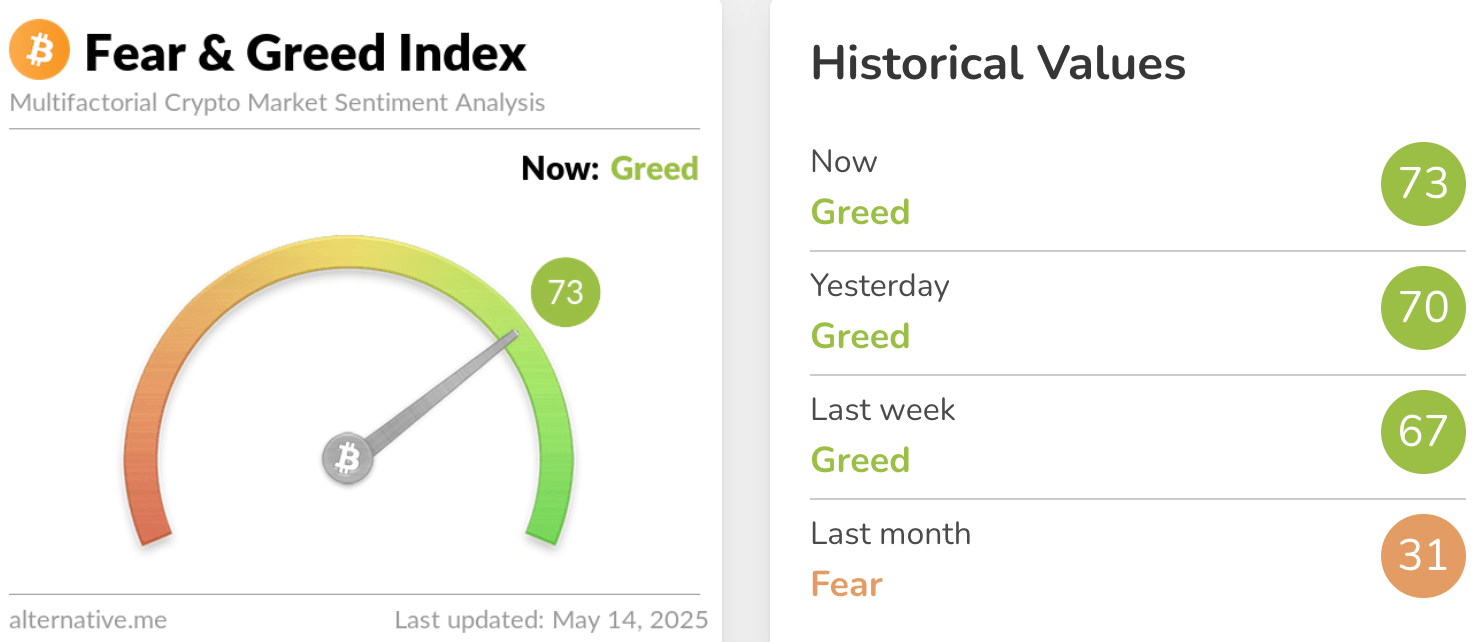 The Crypto Fear & Greed Index shows the sentiment has improved steadily over the past week. The indicator reads 73 at the time of writing, up from 67 last week.