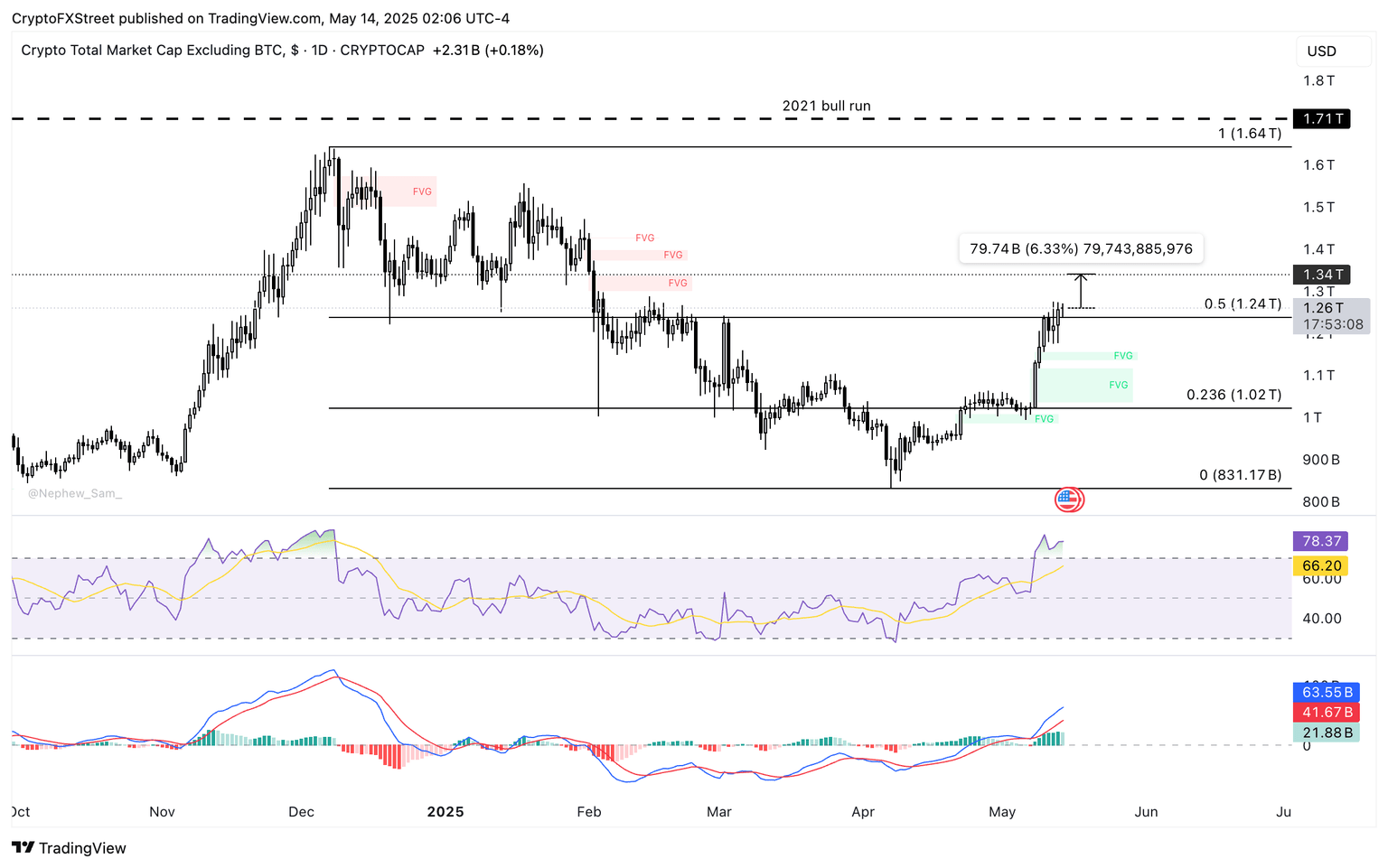 Data from CoinGecko shows that top 10 cryptocurrencies by market capitalization registered nearly double-digit gains in the last seven days. The total market capitalization of cryptocurrencies barring Bitcoin is back to a level previously recorded in February, just 6.33% away from $1.34 trillion, a key level marked by the upper boundary of a Fair Value Gap (FVG) on the daily price chart.