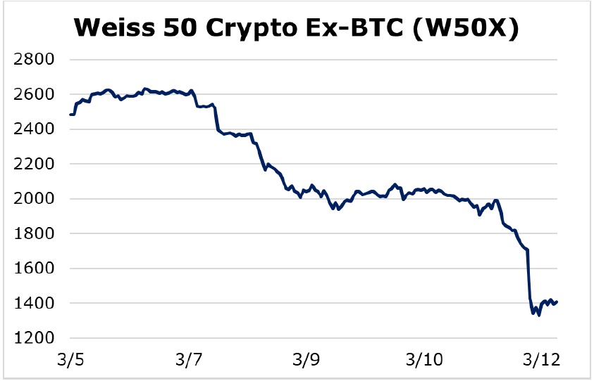 We see a similar picture in our Weiss 50 Ex-BTC Crypto Index (W50X), which ended down 43.41% for the week.