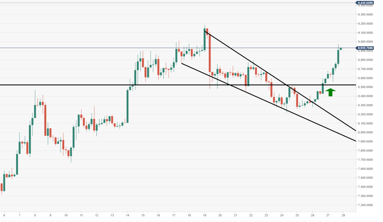BTC/USD is currently trading at $8,400 (+3.40%) in the afternoon in U.S. hours, bulls manage to break back above $8500 barrier.
