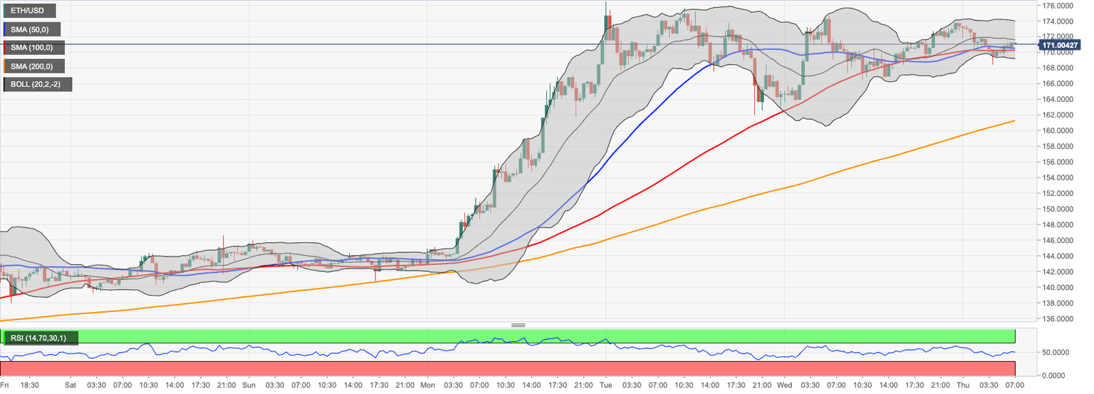 At the time of writing, ETH/USD is changing hands at $170.90. The second-largest coin recovered from the Asian low of $168.42, though it is still 1.3% lower from the start of the day. ETH/USD is moving in a short-term bearish trend amid low volatility.
