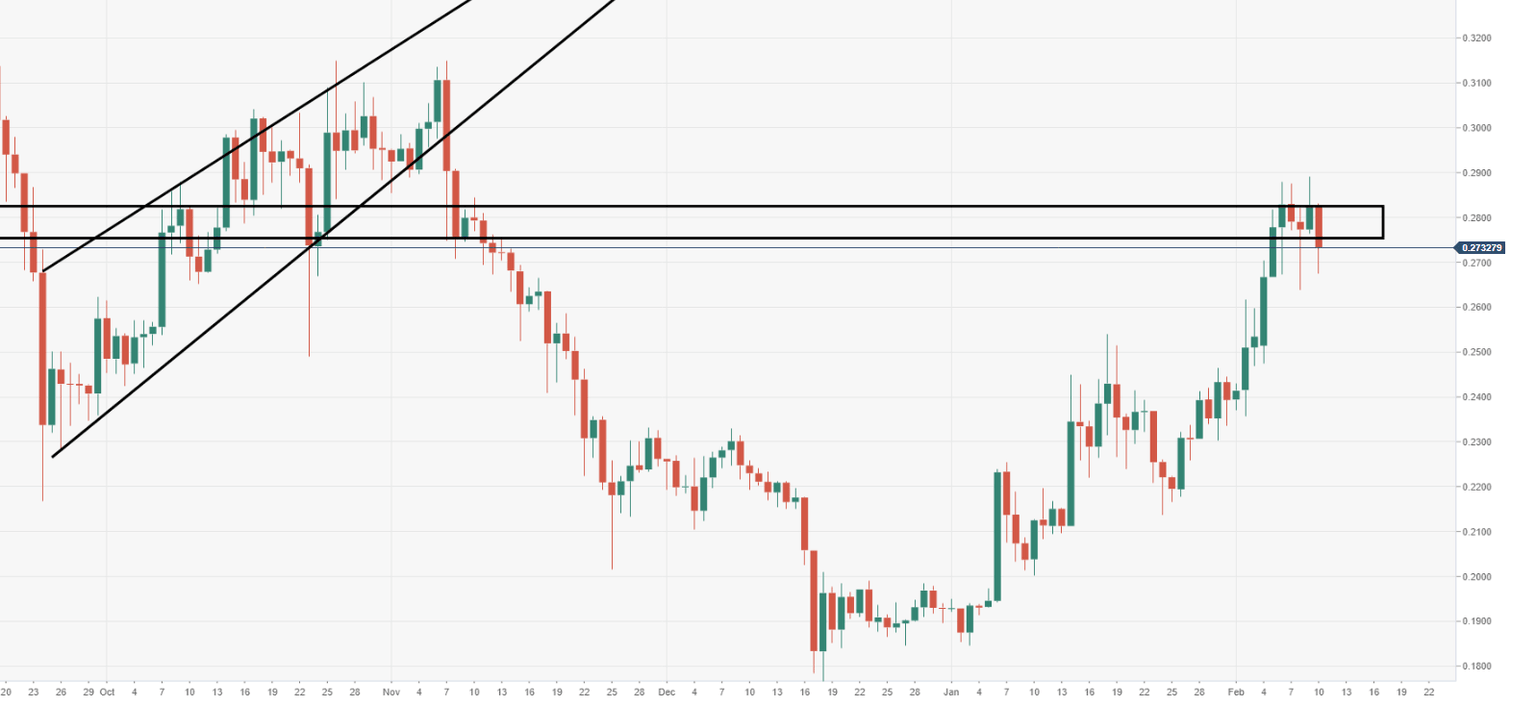 XRP/USD is currently trading at $0.2799 (-2.95%), $0.3000 is proving to be much of a challenge to claim.