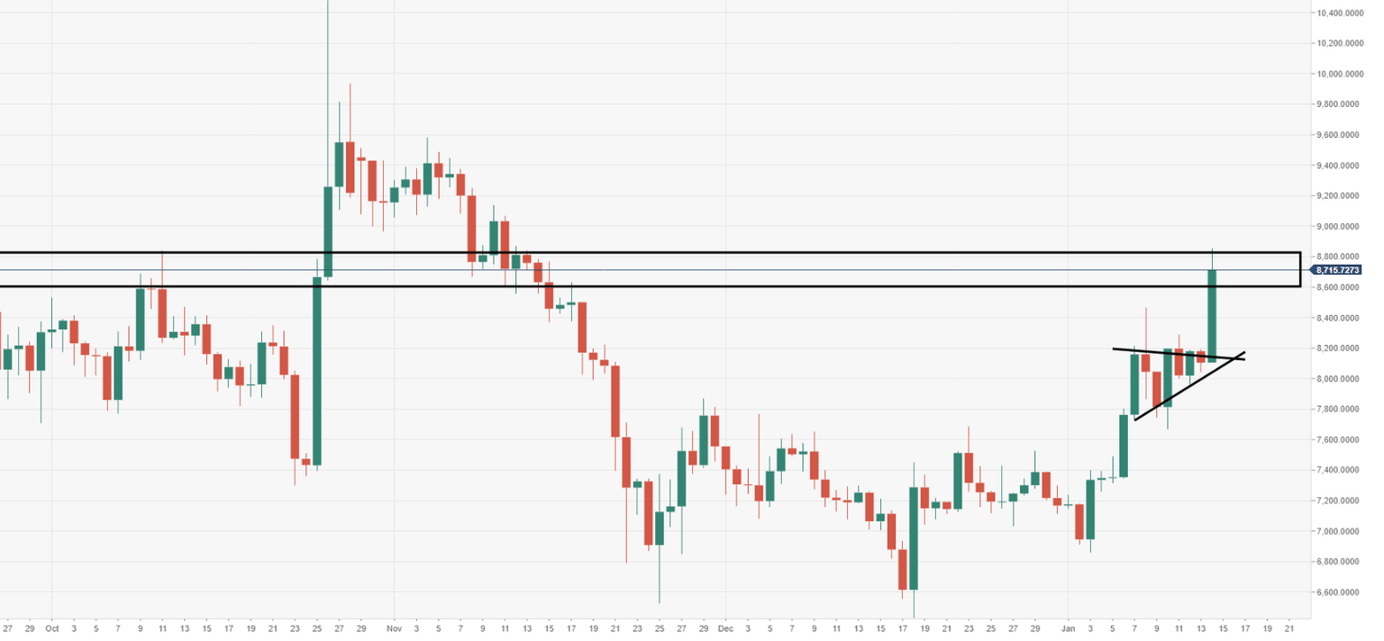 BTC/USD is currently trading at $8,780 (+7.80%) in the afternoon in U.S. hours, as the bulls break down $8500 barrier.
