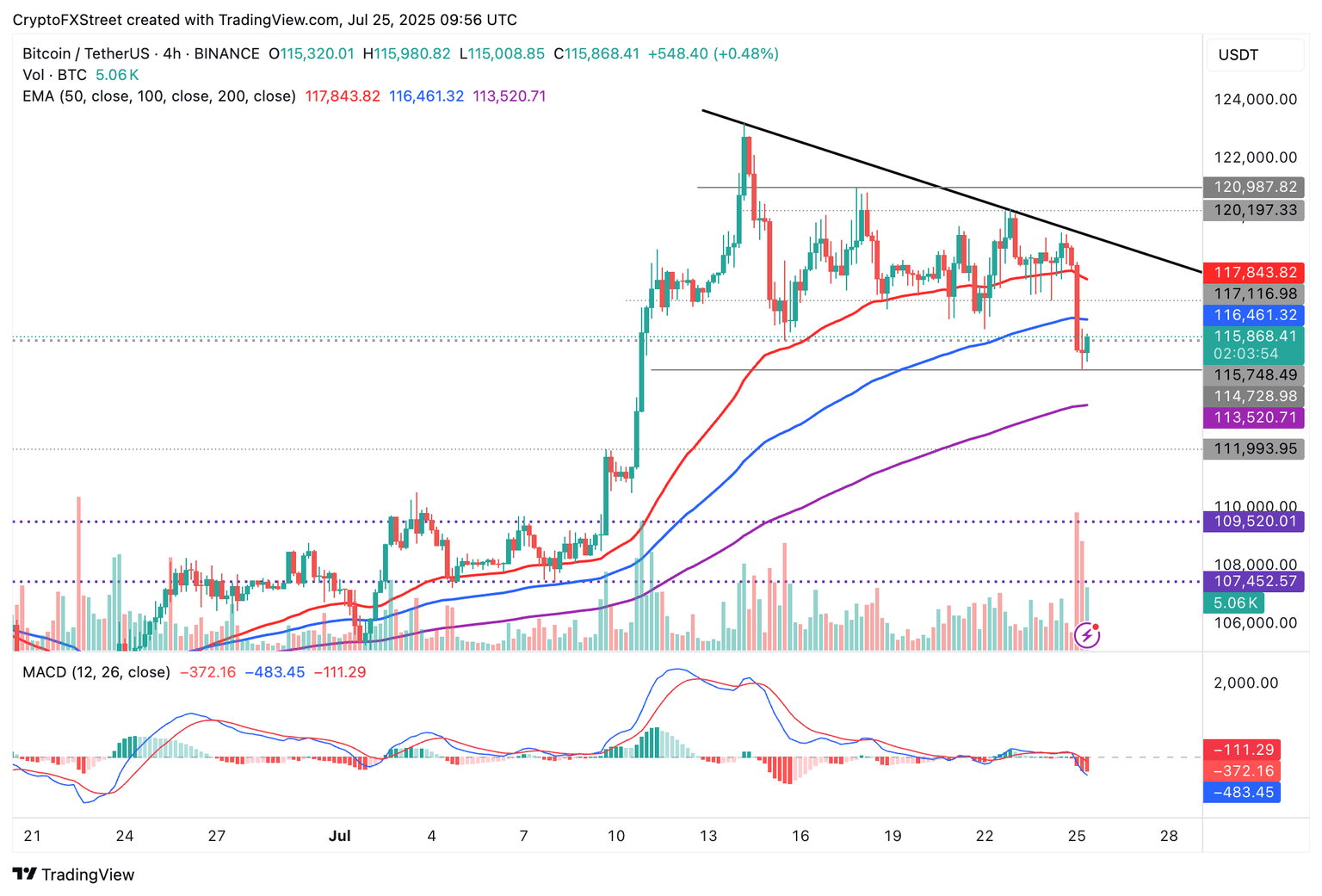 Bitcoin price has extended its decline after peaking at $120,090 on Wednesday. A support at $114,728 halted the down leg, paving the way for a minor reversal to $115,868 at the time of writing.