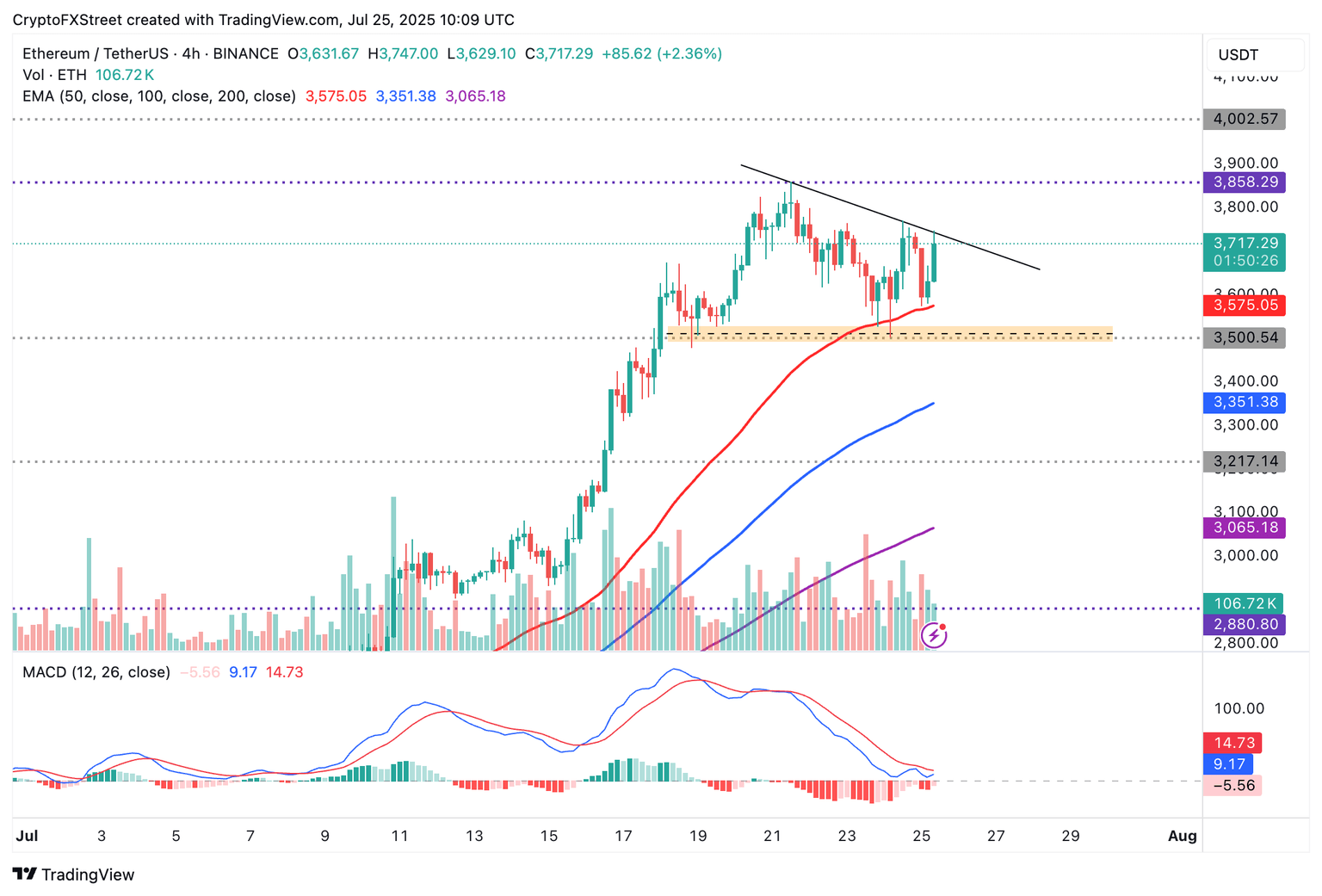 Ethereum price is getting closer to another breakout after rebounding from support near $3,500. The 4-hour chart below shows ETH price testing the trendline resistance, which, if broken, could encourage risk-on sentiment and boost the uptrend toward the $4,000 milestone.