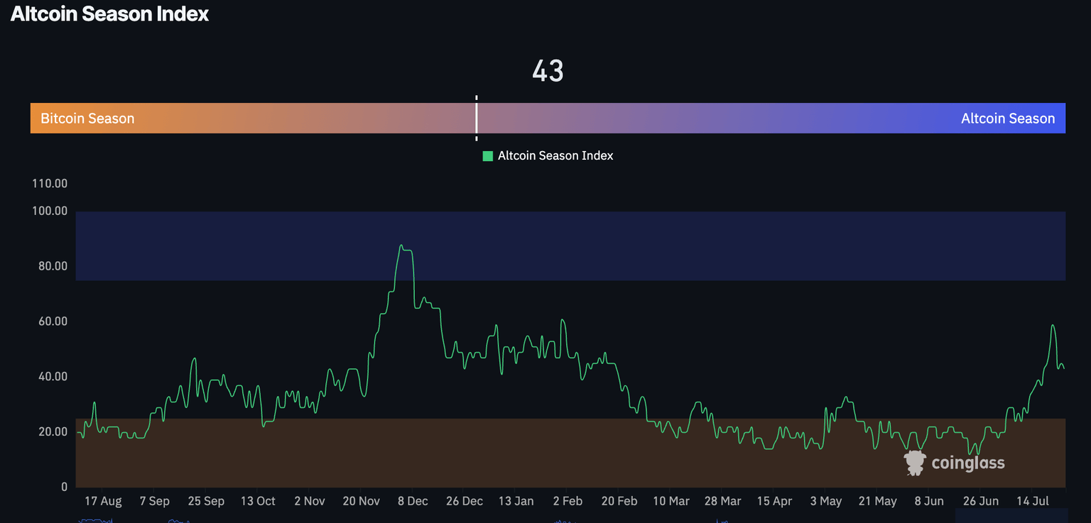 A glance at the Altcoin Season Index suggests a pause in the altcoins' rally. CoinGlass data shows the index reversing to 43 after peaking at 59 on Monday, nearly three times the value of 20 on July 1. It is not the altcoin season until the index hits 75, indicating aggressive capital rotation from Bitcoin into other tokens.