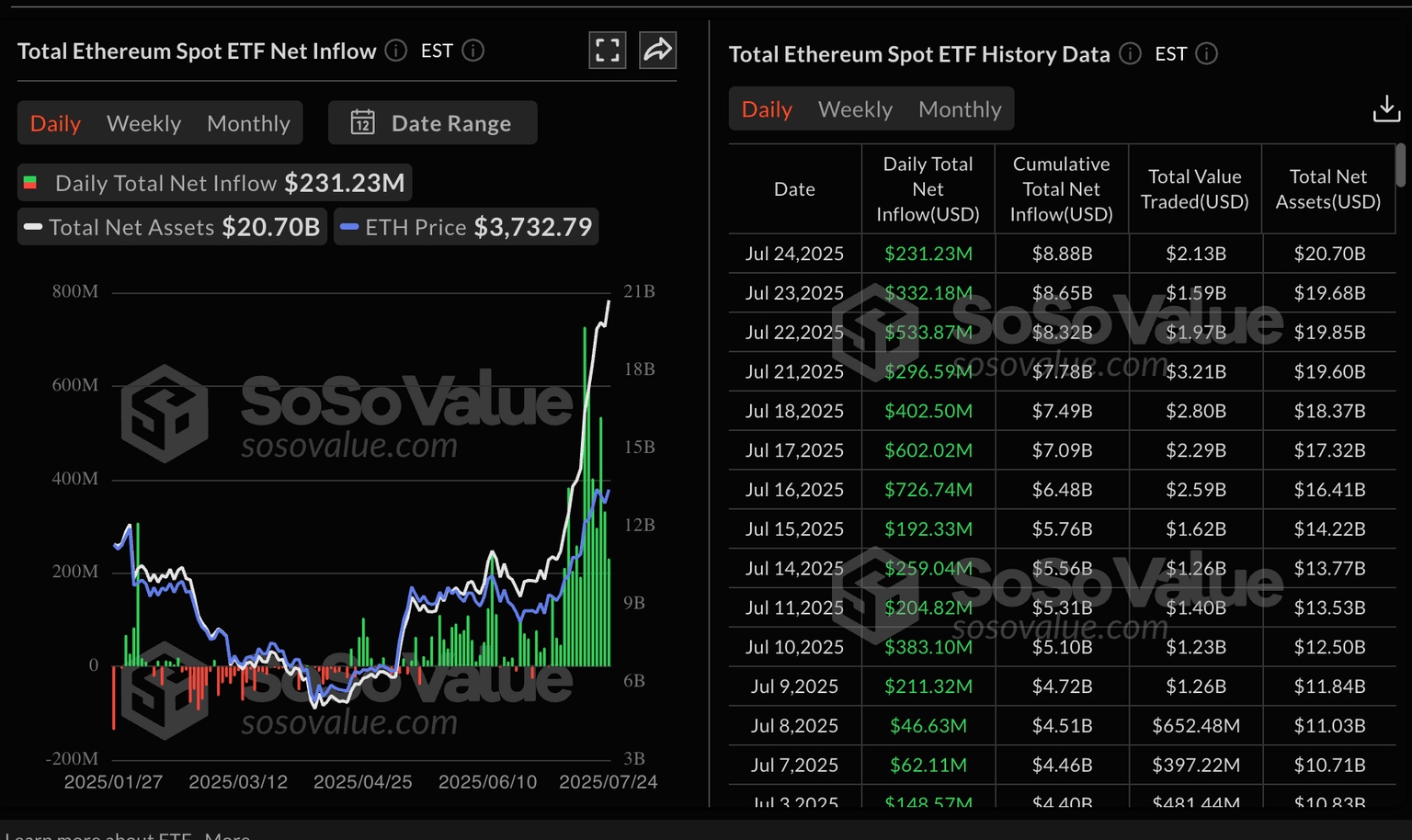 Ethereum spot Exchange Traded Funds (ETFs) continue to post steady inflows despite the headwinds in the crypto market. According to SoSoValue, investment products licensed in the United States (US) experienced a daily net inflow of $231 million on Thursday, which fell below Wednesday's capital inflow of $332 million. Currently, the total cumulative net inflow stands at $8.88 billion, with net assets averaging $20.7 billion.