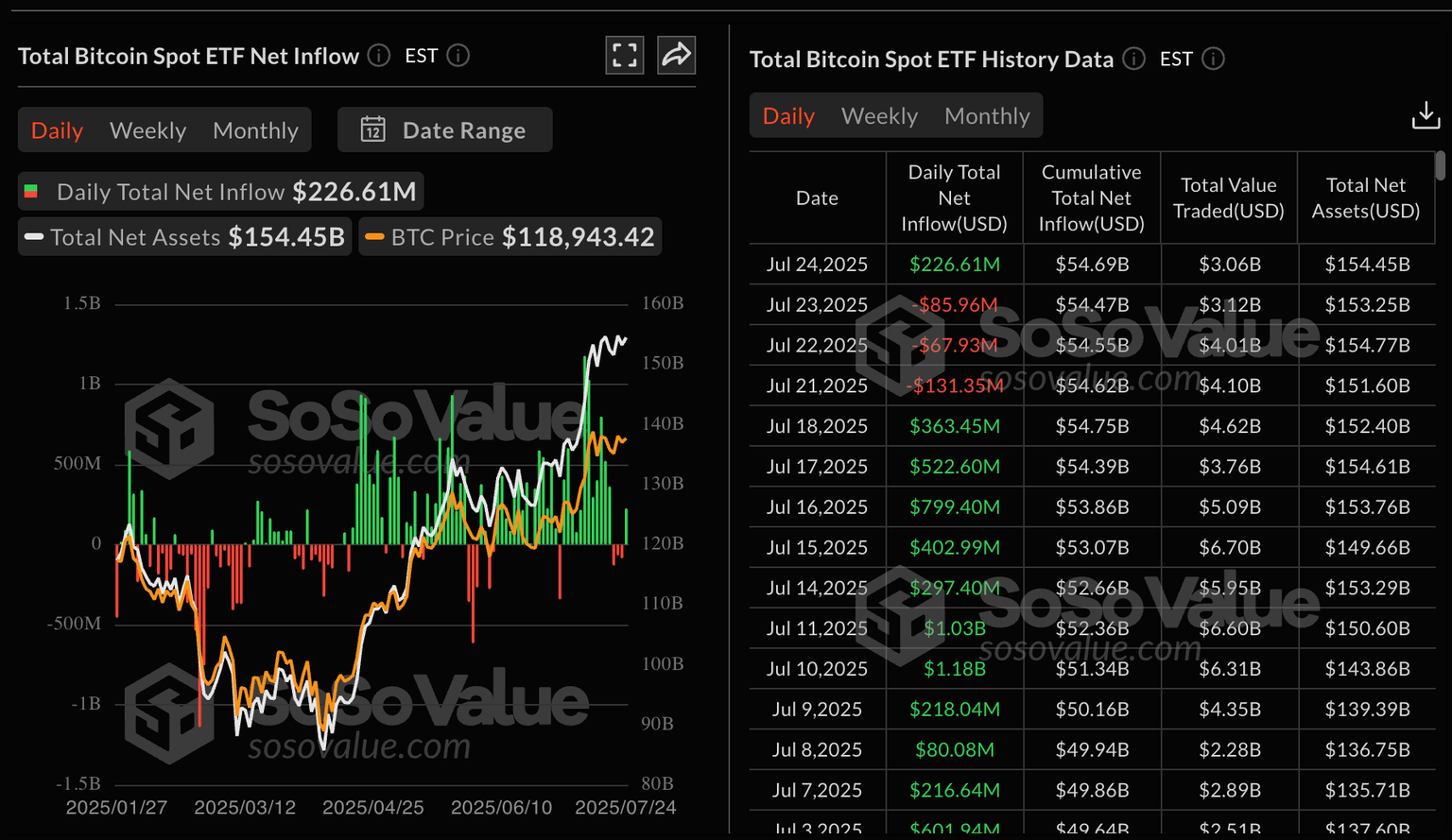Bitcoin spot ETFs recorded their first net inflow volume this week, at approximately $227 million on Thursday, signaling an improvement in sentiment. Suppose investors anticipate volatility in the US Dollar (USD) due to the implementation of President Donald Trump's higher tariffs on August 1. In that case, they will likely seek exposure to hedge assets like Bitcoin and Gold, thus keeping prices near the all-time high.