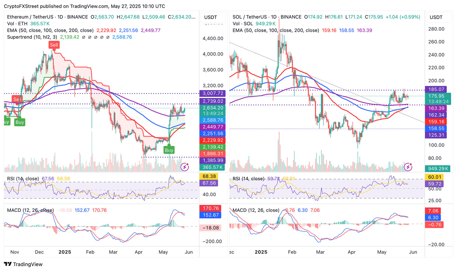 The largest altcoin by market capitalization, Ethereum, is steadily rising its uptrend, rising almost 3% on the day to exchange hands at $2,638. ETH sits on top of key moving averages, including the 50-day Exponential Moving Average (EMA) at $2,229, signaling a potential crossover above the 100-day EMA at $2,254.