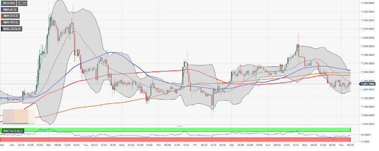 - The BTC/USD is currently trading at $7,233 (-2% a day-to-day basis). The coin has been locked in a tight range with bearish bias during early Asian hours on Tuesday.