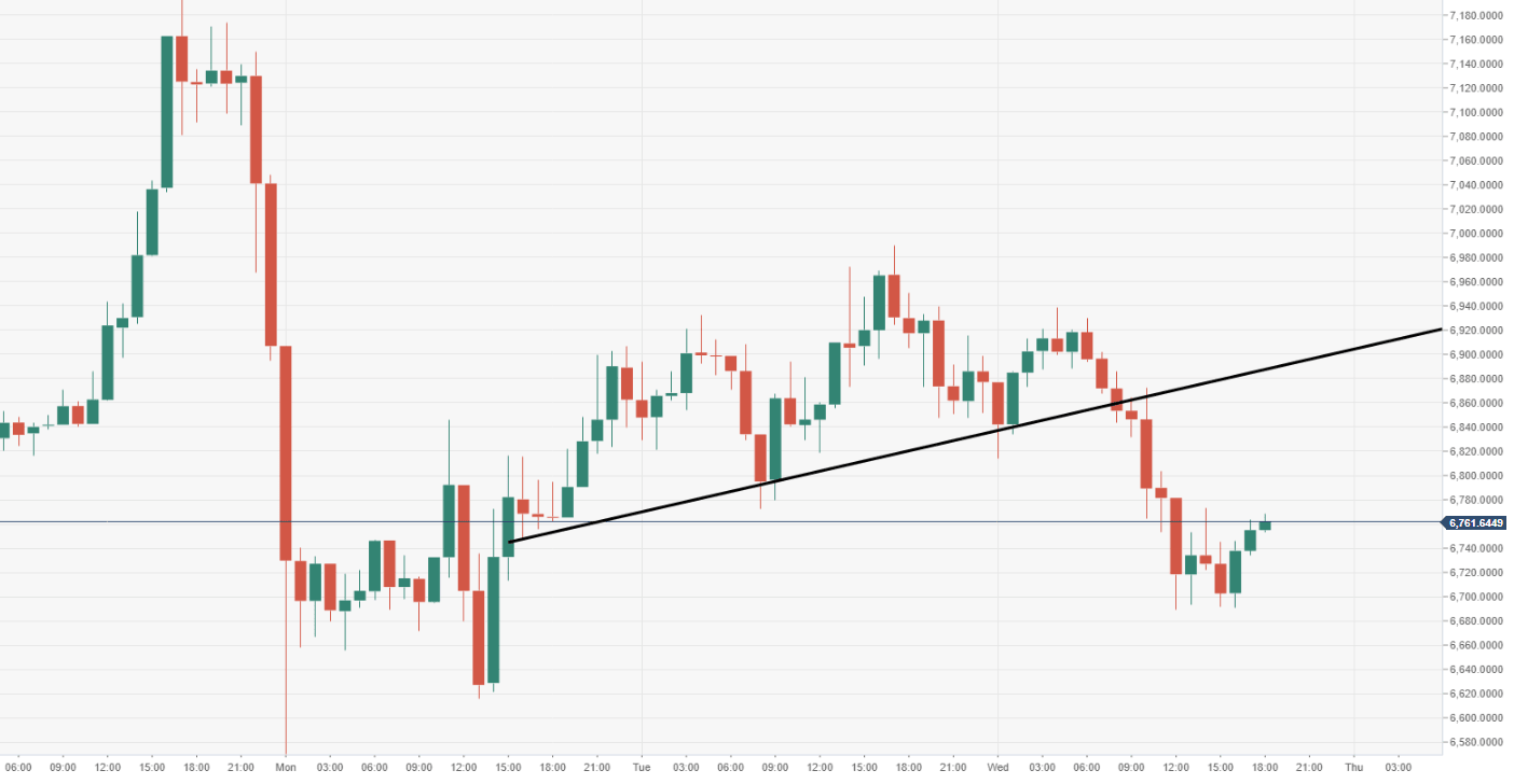 BTC/USD is currently trading at $6800 (-1.15%), bearish momentum comes back into play following a critical $7000 breach.