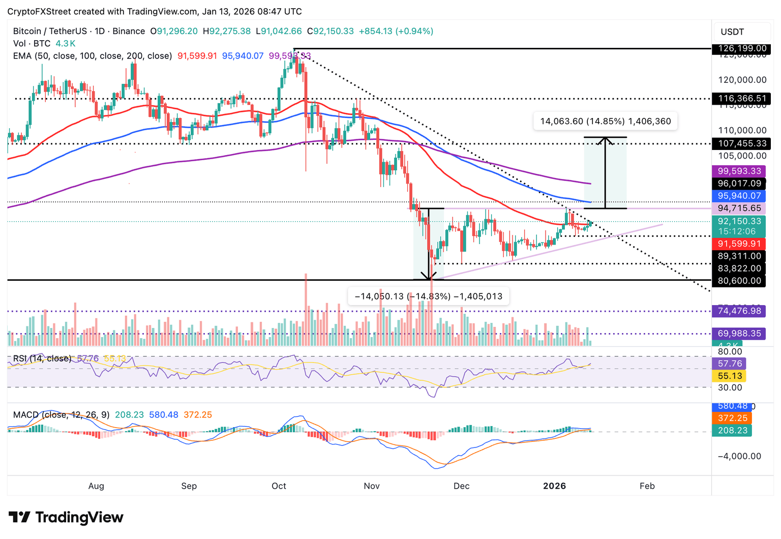 The Relative Strength Index (RSI) on the daily chart, at 58, is rising in tandem with the price, indicating that bullish momentum is steadying. Higher RSI readings toward the overbought territory would increase the odds of a technical breakout above $100,000.
