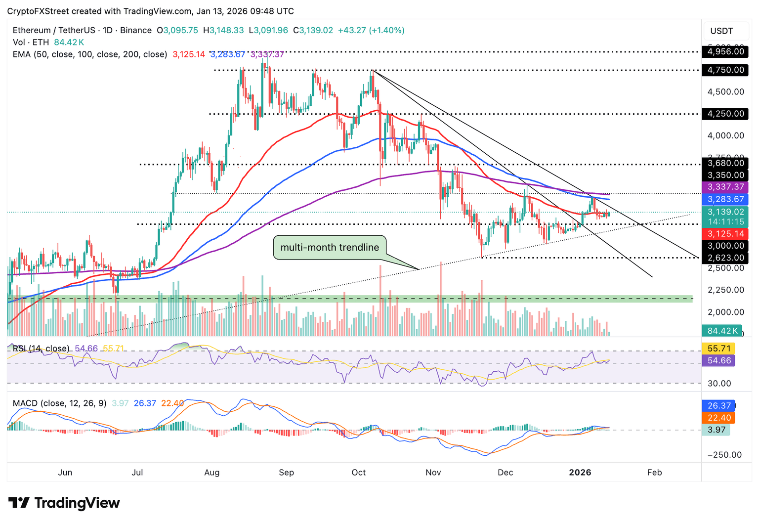 A close above the descending trendline resistance would increase the odds of a breakout toward the 100-day EMA at $3,283 and the 200-day EMA at $3,337. Conversely, losing the 50-day EMA as the immediate support may lead to a 4% decline to $3,000.