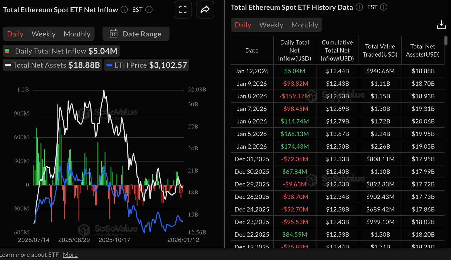 Ethereum spot ETFs listed in the US posted mild inflows of approximately $5 million on Monday following three consecutive days of outflows. Grayscales’ ETHE emerged as the top-performing ETF, with almost $51 million in inflows. The cumulative inflow volume stands at $12.44 billion and net assets at $18.88 billion, according to SoSoValue data.