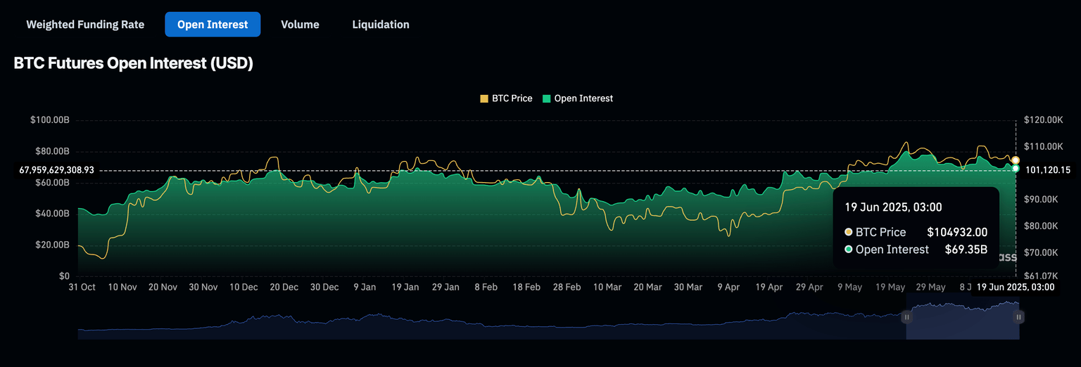 The Bitcoin futures contracts' Open Interest (OI) has maintained an overall downtrend after peaking at $80 billion on May 23, shortly after reaching all-time highs of $111,980. CoinGlass shows the OI, which represents the value of all active futures and options contracts that have yet to be closed or settled, standing at $69 billion on Thursday.