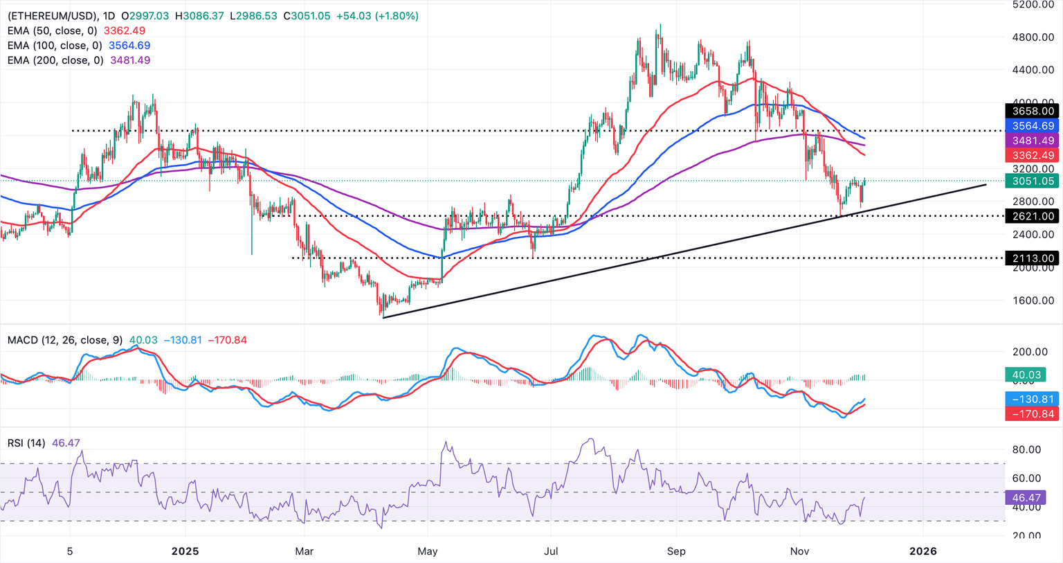 The rising trend line from $1,383 underpins the outlook, offering support near $2,678. A daily close above the first barrier (50-day EMA at $3,362) could open the door toward the next moving average (200-day EMA at $3,481), while rejection would keep risks tilted toward the trend-line support.
