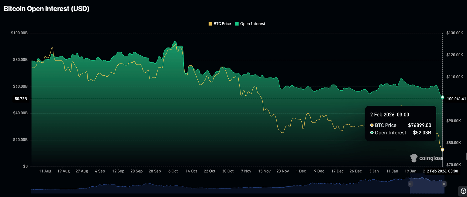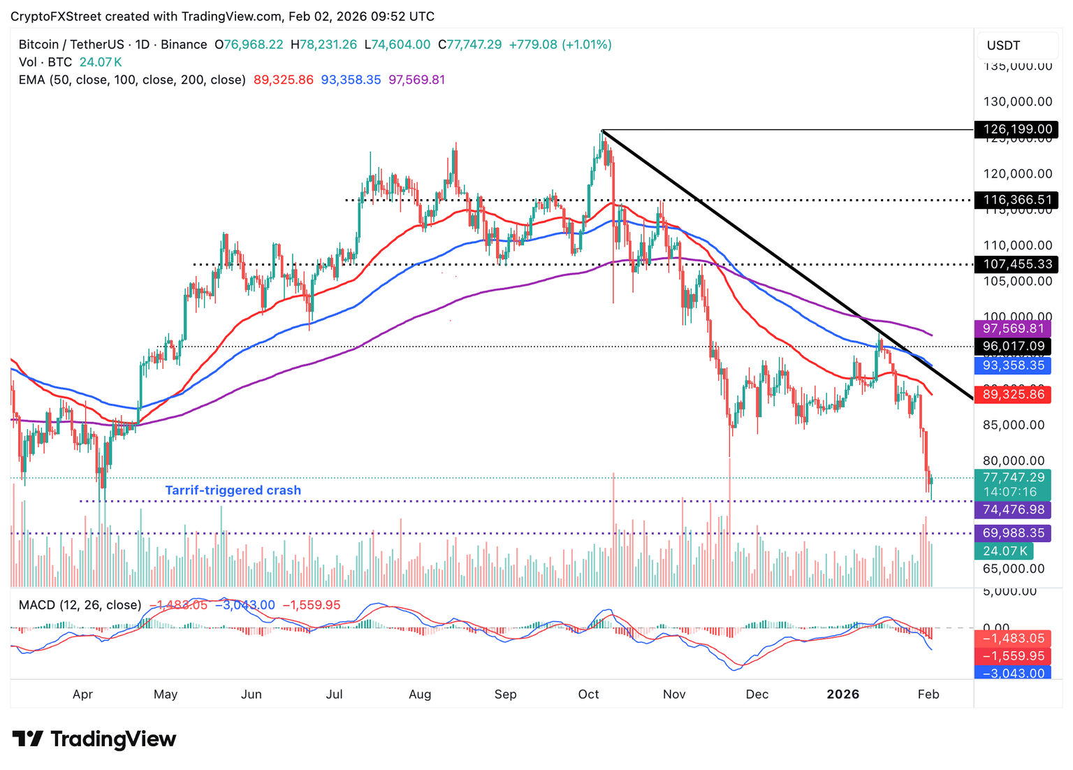 Bitcoin (BTC) is trading under pressure at the time of writing on Monday, as digital assets across the board extend their correction following a turbulent week. The King of Crypto holds above $77,000 after a sharp decline that briefly tested lows last seen during April’s tariff-driven selloff at $74,476.